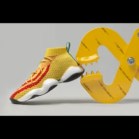 The bright yellow kicks feature red and green accents and ‘AMBITION’ embroidered on the vamp of each shoe in white. The colorway serves as a nod to the LA's famous fruit stands. Pharrell says this sneaker is the first step into his basketball journey with Adidas.