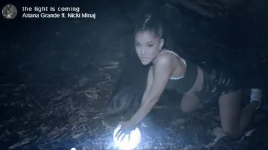 Ariana Grande finally drops her music video for "the light is coming," and although it's literal in a way, it differs from what might be expected. The setting is reminiscent of the greenery scenes of Rihanna's "S.O.S." music video, minus the hi-beam feel of the lights. The opening shows a tree's giant root coming from the earth. We follow its length until we find Nicki. The rapper delivers her verse in the dark, surrounded by billowing fog. Then comes Ariana. She prances and crawls in the forest. Lays her back down on a rock, pulls on her iconic ponytail. She's doing the most. It doesn't sound particularly cute, but it is. The video can legit be watched without sound for another layer of entertainment, no joke.