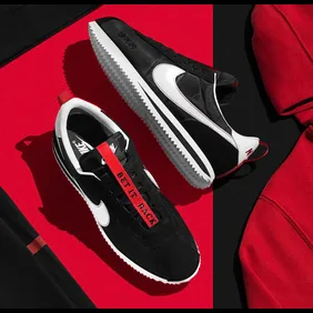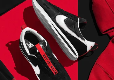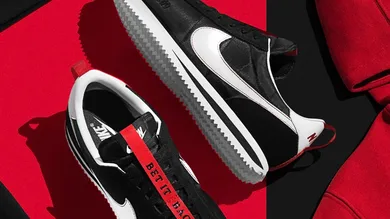 The newly unveiled Kendrick Lamar x Nike Cortez collab features a black upper accompanied by a red tongue ribbon that stretches from the top of the tongue to the base. Additionally, the kicks are highlighted by a white swoosh to match the heel counter and midsole, and another red tab on the heel.
