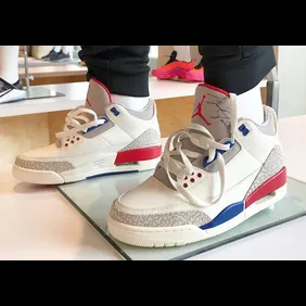Inspired by Michael Jordan’s performance in Magic Johnson's 1998 Midsummer Night’s Magic Charity Game, this upcoming Air Jordan 3 sports a patriotic color scheme, complete with a "sail" tumbled leather upper, accompanied by hits of red and blue. Additionally, the "Charity Game" 3s feature a starry graphic print on the inner lining and a grey tongue to match the elephant print.