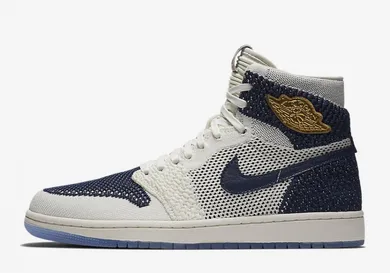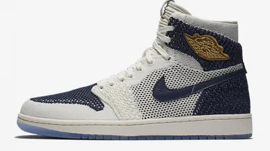 The kicks feature a cream-flavored sail and navy upper as well as some gold detailing throughout the silhouette. An icy blue outsole sits beneath with a graphic that reads, "The Captain" with Jeter's retired #2 in place of the 'N.' The "RE2PECT" Air Jordan 1 Flyknit will be available at several major retailers including Champs Sports and Eastbay.
