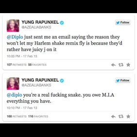 After another Twitter spat with Perez Hilton last week, Azealia Banks has publicly stirred the pot again, this time calling out friend and collaborator Diplo over the recent 'Harlem Shake' remix fiasco. Baauer, who's signed to Diplo's Mad Decent roster, asked her to take down her remix of his track "because it wasn't her song" (it's now a viral YouTube phenomenon). She responded via Twitter, calling him a pussy.