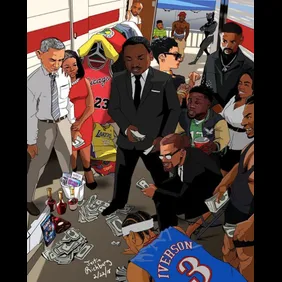One artist's unique expression of portraying some of the most talked about names in the Black Community - from both the past and present - has sparked some controversy. Philadelphia-based artist Justin Richburg shared his drawing of Barack and Michelle Obama, Malcolm X, Kevin Hart, Martin Luther King Jr., Rihanna, and Mike Tyson all playing a game of dice, with Will Smith, Denzel Washington, Charlamagne Tha God, Tupac and Black Panther watching on the sidelines.
