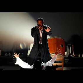 The spotlight would then shift back K.Dot as he unleashed lines from his verse on Rich The Kid's "New Freezer" banger as a woman played a large drum by his side. The performance would conclude with Dave Chappelle appearing onstage once more asking if this performance was "on cable" before Kendrick would unleash his "King's Dead" verse and his "DNA."