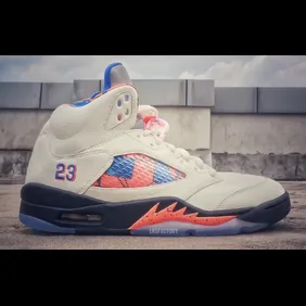 The kicks, which emit a strong New York Knicks vibe, are built on a "sail" tumbled leather, accompanied by orange and blue hues on the shark teeth, inner lining, tongue and "23" branding. Additionally, the mesh paneling of the Air Jordan 5 features a blue and orange geometric pattern which can also be seen on the lining.