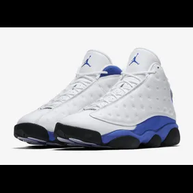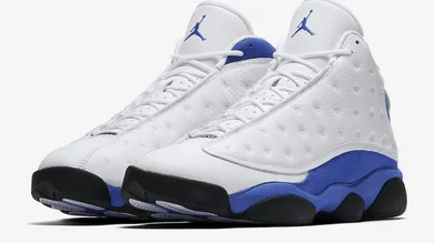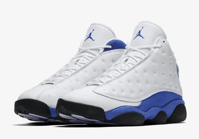 The new-look 13s are styled just like the iconic "Varsity Red" colorway, featuring a white tumbled leather upper and a black outsole. Obviously, the major difference is the "Hyper Royal" suede and Jumpman on the tongue in place of the familiar Varsity Red. Kid's sizes will be available as well.