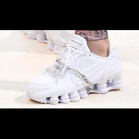 At this weekend's Ready to Wear runway show in Paris, Comme des Garcons introduced the latest sneaker collab, which features chrome and gold chains that wrap around the tongue and through the Shox tooling beneath the upper. Additional details include frayed detailing on the Nike swoosh, heel and toe box, as well as CDG branding on the tongue.