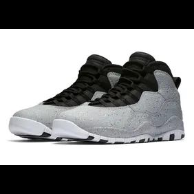 This latest Air Jordan 10 features a light grey leather upper peppered with black and white speckles which are reminiscent of the iconic cement print details seen on shoes like the "White Cement" Air Jordan 4. Additional details include a black leather tongue, ankle collar and inner lining, as well as a retro multi-color patch on the inside of the tongue and a white and black striped outsole (complete with a red jumpman logo) which highlights some of Michael Jordan's greatest accomplishments.