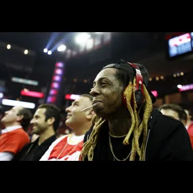 Travis wasn’t the only rapper in the building rooting for the Rockets however. Lil Wayne was also on the home teams side as he was spotted cheering them on in an earlier clip. Weezy was there with Mack Maine, and once again had his big headphones on him throughout the game, but who knows if he’s listening to any music while watching? I’d hope not anyways.