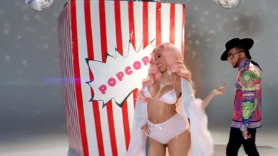Their lyrical flows are complimented with dynamic visuals, featuring a candy-colored esthetic and playful props, like an oversized bag of popcorn and pink rapping pineapples. Dancers rock the frames along with both entertainers, turning up to the sexy club track as they all feed off each other's energy.