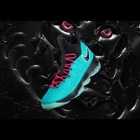 Fans of LeBron's signature sneaker line will notice that the kicks are inspired by the classic "South Beach" Nike LeBron 8, which sports a teal upper accompanied by hits of pink and black. The "South Beach" LeBron 15 PE that was worn last night in Miami matches that design to a tee and even includes the black Nike swoosh on the Battleknit upper.