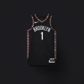 The all black uniforms are highlighted by a Coogi-themed, multi-color "Brooklyn Camo" pattern that runs down the sides of the jersey and shorts and along the sleeve and neckline piping. Additionally, a customized *BED-STUY* mark for each player has been designed by renowned graffiti artist Eric Haze and been placed above the jersey's jock tag.