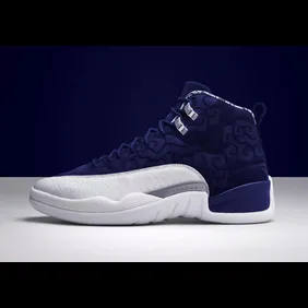 The special edition "International Flight" Air Jordan 12s feature a navy suede, complete with an embossed, kimono-inspired print on the upper, as well as a koi fish scale print on the mudguard. Additionally, Japanese characters which translate to "Air Jordan" are stamped on the heel.