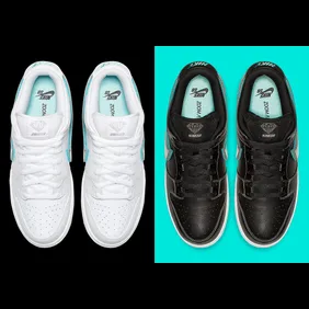 Diamond Supply Co. and Nike have teamed up for a limited edition sequel to the original "Tiffany" Nike SB Dunk Low that released in 2005. Diamond Supply founder Nick Tershay aka Nicky Diamonds recently revealed two colorways - one black, one white - both of which feature velcro Nike swooshes featuring the familiar "Tiffany" blue shade underneath.