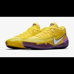 The flyknit of the Lakers-themed Kobe AD NXT 360 comes doused in a vibrant yellow, accompanied by a translucent purple outsole and purple logos on the tongue. The kicks also feature a large, white Nike swoosh and red branding on the heel.