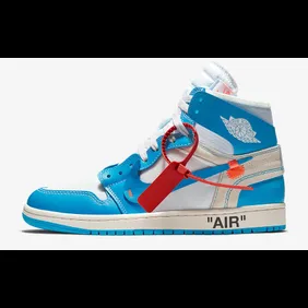 The "Power Blue" aka "UNC" Off-White x Air Jordan 1 features the same color blocking as the "Chicago" colorway that dropped in 2017, but the Bulls' red has been swapped out for Tar Heels' powder blue. The UNC-inspired kicks include all the familiar attributes of a Virgil Abloh AJ1, most notably the "AIR" text on the midsole and orange stitching.