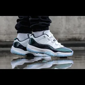 The kicks feature a white leather construction accompanied by an iridescent emerald green patent leather and a translucent icy blue outsole, making for one of the most unique Air Jordan 11 colorways to date. While the early images looked very similar to the "Concord" colorway, the patent leather does emit an iridescent green tint when the light hits, which separates this pair from the aforementioned.