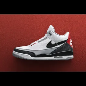 The "Tinker Hatfield" Air Jordan 3 features the familiar "Fire Red" colorway that was seen on the original Air Jordan 3 but there are a number of modifications, most notably, the black Nike swoosh across the upper. Additionally, the "Tinker" 3s feature light grey mudguards, black upper midsoles, grey “NIKE” text stitched on the medial side, and Tinker's unmistakable signature on the inside of the tongue.