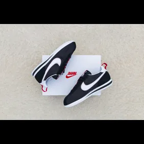 The Kendrick Lamar x Nike Cortez Kenny III collab features a black upper accompanied by a red tongue ribbon that stretches from the top of the tongue to the base. Additionally, the kicks are highlighted by a white swoosh to match the heel counter and midsole, and another red tab on the heel.
