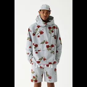 A lightweight 100% cotton seersucker with custom floral print is the first fabric. Two colors are used across a range of styles, including the hooded Harrison Pullover, the raglan sleeve Howard Tee, the Stryker Pant, and the Track Short.