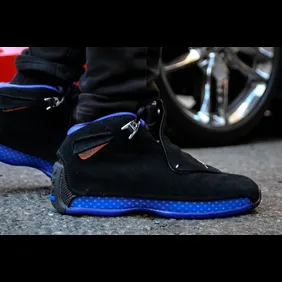 Looking just as they did 15 years ago, the Air Jordan 18 "Black/Sport Royal" is comprised of a black suede throughout the upper, including the removable lace shroud. Additional details include metallic silver eyelets and branding, royal blue accents that appear on the inner lining and midsole, and flaps on the ankle that are inspired by the air vents on the Lamborghini Murcielago.