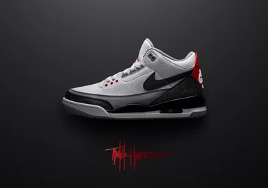 The "Tinker Hatfield" Air Jordan 3 features the familiar "Fire Red" colorway that was seen on the original Air Jordan 3 but there are a number of modifications, most notably, the black Nike swoosh across the upper. Additionally, the "Tinker" 3s feature light grey mudguards, black upper midsoles, grey “NIKE” text stitched on the medial side, and Tinker's unmistakable signature on the inside of the tongue.