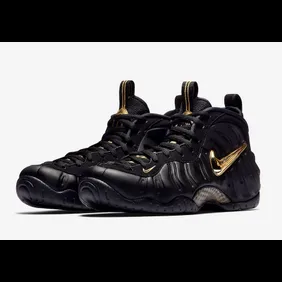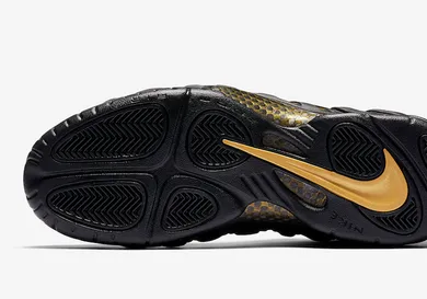 The kicks feature a black Foamposite shell equipped with metallic gold detailing throughout, including the Nike swooshes on the heel and upper. The "Black/Metallic Gold" Foamposite Pro is also highlighted by a strip of gold that runs down the black tongue and gold text on the black heel tab.