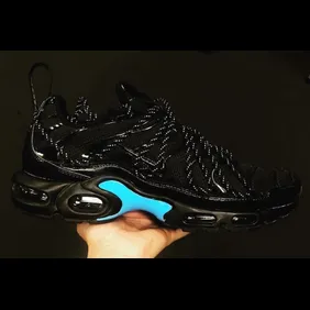 Drake took to instagram last night to unveil a never before seen Nike Air Max Plus, which features an all-black build, highlighted by the exposed lacing system covering the entire shoe. Additional details include an added heel tab and blue accents on the shank.