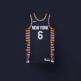 Per the Knicks: "The City Edition uniform represents the unity and diversity of our city. The iconic skyline symbolizes our ambitions and shared dreams. The blue and orange piping pays homage to the 1952-61 Knicks uniform. The first Knicks uniform worn with a non-arched New York wordmark."