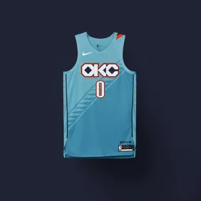 "Interlocking letters create “OKC” on the jersey’s chest, with separate shapes blending into one another to create one shape. Boldly set, the belt pattern on the shorts is derived from a traditional sash and represents the various individual communities expanding outward, pointing toward and blending with each other. Encompassed by the Four Corners, all shapes point inward to gather at OKC. The short vent graphic is inspired by the turtle shell, the circle symbolizes the Earth and recognizes the tribes that line the outside. Primary stripe elements point east to welcome the rising sun and guide the way."