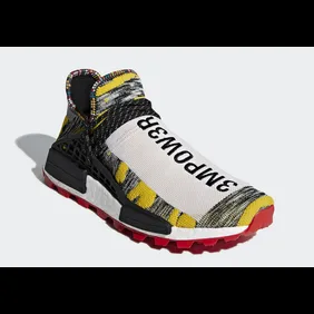 The "Solar Pack" consists of two equally colorful NMD Hu Trail models, each of which features a tribal design throughout, as well as individual messages displayed from ankle to toe, similar to many Pharrell x Adidas NMDs of old. One of the sneakers, dressed in red, black and red has "3MPOW3R" aka EMPOWER etched on the upper. The other sneaker boasts a teal, orange and purple color scheme and reads, "M1L3L3" which translates to forever in Swahili.