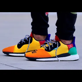 Like many of Pharrell's Adidas collabs, the kicks feature a vibrant, eye-catching colorway consisting of yellow, orange, green, red, purple, black and blue, complete zebra-looking laces and "Hu" branding on the perforated toe. Additional details include a black suede eyestay and black outsole, as well as Adidas branding on the tongue and more "Hu" branding on the outer ankle in white. Beneath it all sits the beloved Boost midsole, appearing just as it does on the wildly popular Adidas Ultra Boost.