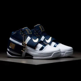 The commemorative sneakers are built on a white, tumbled leather upper accompanied by hits of navy throughout and gold detailing, including the Larry O'Brien trophy hangtag. Select Nike retailers and Nike.com will launch the Nike Zoom LeBron Soldier 1 "25 Straight" ahead of Game 1 on Thursday, May 31st for the retail price of $150.