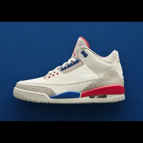 The Air Jordan 3 "International Flight" is inspired by Jordan’s performance in Magic Johnson's 1998 Midsummer Night’s Magic Charity Game. The kicks sport a patriotic color scheme, complete with a "sail" tumbled leather upper, accompanied by hits of red and blue. Additionally, the International Flight 3s feature a starry graphic print on the inner lining and a grey tongue, sporting Michael Jordan's signature, to match the elephant print.