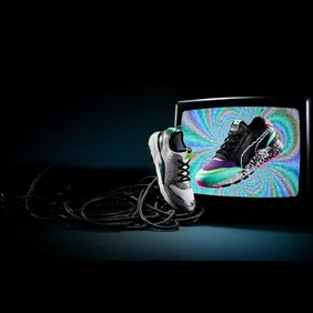 The RS-0 "Game Error" has pops of hot pink, teal green and deep purple along the shoes upper and toe. On the sole is a black and white digitized coding pattern emulating an “error” screen when playing video games. The black formstrip is outlined in a teal pixelated graphic.