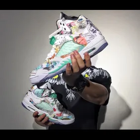 Rather than opting for the traditional red, white and black colorway that has been used on countless Air Jordans over the years, this Air Jordan 5 instead features a range of vibrant colors and drawings depicting numerous Chicago neighborhoods.