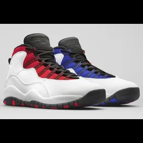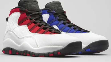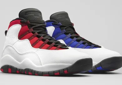 The unique 10s feature a white tumbled leather upper, accompanied by red detailing on the lateral portion of the shoe and blue on the medial side. The iconic Air Jordan 10 sole is also split down the middle in the same red/blue color scheme, while the insole references Westbrook's graduating class of 2006 as well as his "RW" logo.