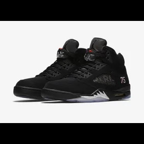 The "PSG" 5s are built on a stealthy, all-black suede upper reminiscent of the club's alternate kit as well as the team's logo on the heel of both shoes. Additionally, the newly unveiled sneakers have "75" embroidered near the heel in place of the familiar 23, and a graphic underneath the mesh paneling, which reads "Paris" with a Jumpman in place of the "A." The 75 is reportedly a reference to zip codes used throughout the city of Paris.