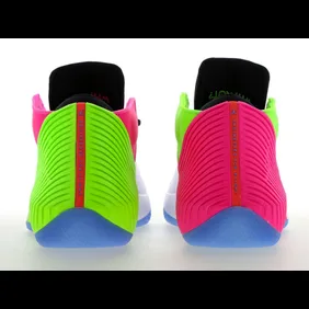 The kicks feature a white and black upper grounded by an icy blue outsole, accompanied by mismatching lime green and pink detailing about the ankle collar and heel. Additional details include metallic Silver Jumpman logos, Westbrook's "RW" logo on the tongue of the right shoe, a Quai 54 logo on the tongue of the left shoe, and "Why Not?" text on the inside of both.