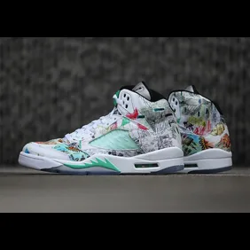 Dubbed the "Wings" Air Jordan 5, the kicks are built on a white leather upper that has been turned into a decorative art piece complete with hits of teal, including the mesh panels, and a red jumpman on the heel. Additional attributes include a wings shaped lace lock, "Wings" logo behind the tongue and winged detailing on the mesh which also glows in the dark.