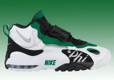 Decked out in white, black, silver and pine green, the special edition Air Max Speed Turf also features "PHI" branding on the lateral forefoot as a nod to the city of the defending Super Bowl champions.