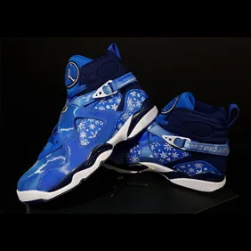 This all-new Air Jordan 8 is not only highlighted by its two-toned blue upper and snowflake detailing (from which the sneaker earns it's moniker) but also by the patent leather finish that appears on the toe and crossing strap.