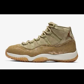 The "Olive Lux" Air Jordan 11, which was recently introduced as part of Jordan Brand's 2018 Women's Holiday collection, is comprised of an olive suede upper accompanied by a light brown textured overlay, white midsole, gum outsole and a "metallic stout" Jumpman near the heel. The kicks are expected to release on Black Friday, November 23, for the retail price of $220.