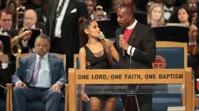 On Friday, Ariana Grande served as a special musical guest at the funeral of the great Aretha Franklin, where she performed Aretha’s hit song “You Make Me Feel Like” live in front of thousands in attendance & millions watching on TV. Well after her performance, Bishop Charles H. Ellis III embraced Ariana in his arms as he tried to be funny by giving a dad joke in the process. “When I saw Ariana Grande on the program, I thought that was a new something at Taco Bell,” he said as the crowd bursted out into laughter.