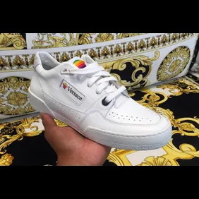The Versace x Apple kicks feature the same white leather upper as the original, but the rainbow apple logo on the tongue has naturally been swapped out in favor of a ROY G BIV Versace logo, along with Versace text on the side.