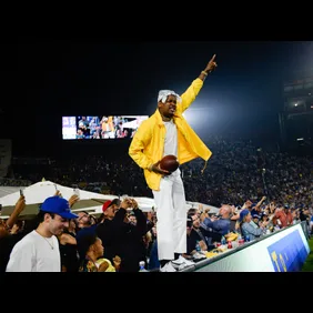 After the touchdown, Woods sprinted to the back of the endzone where he found YG, dressed in yellow without a hint of blue, and presented him with the game ball.