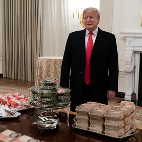 Trump is getting roasted all over Twitter -- once again -- for his antics inside of the White House. Yesterday, Trump had the Clemson Tigers, who recently won the national football championships, at the White House for dinner. However, due to the government shutdown, Trump had no cooks inside of the White House so he opted to cop the team "great American food": McDonald's, Dominos, Wendy's and Burger King. Trump bragged about personally buying the team dinner in a since-deleted tweet, saying, "Great being with the National Champion Clemson Tigers last night at the White House. Because of the Shutdown I served them massive amounts of Fast Food (I paid), over 1000 hamberders etc. Within one hour, it was all gone. Great guys and big eaters!"