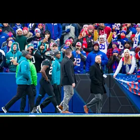 Following a brawl between the Jags and Bills, Leonard Fournette was escorted to the locker room after being ejected when someone in the crowd chucked a can of beer that hit the Pro Bowl running back square in the helmet.