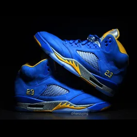 Inspired by the colors of Michael Jordan's high school, the kicks are decked out in a blue suede accompanied by yellow accents. Additional details include a grey midsole with a blue and yellow speckle, an icy blue outsole and a yellow, chenille Jumpman logo on the grey tongue. Additionally, there's also a varsity maize "Laney" Air Jordan 5 in the works, though images have not yet surfaced.