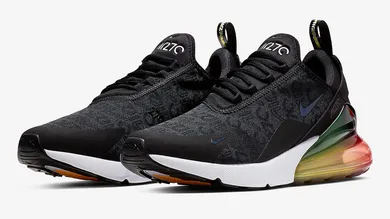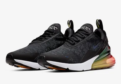 This latest colorway has a black and greyish upper with writing etched throughout. The shoes also have a blue jewel swoosh near the toe box and then a second blue swoosh near the back. Having listed these features, the real draw to this shoe is the air bubble on the heel which has green towards the top and then transitions from yellow, to orange and then to red towards the back. There is also white "Air 270" branding on the tongue, adding a flash of color on the all-black upper.